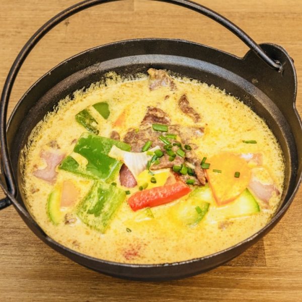 Lomo de ternera brócoli, seta negra, bambu con salsa de curry japonesa en Hot-Pot.