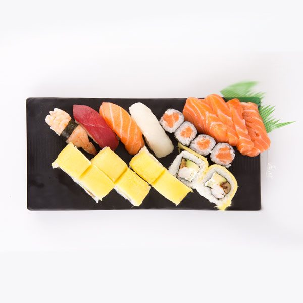 6 sushi atún,  8 sushi salmón,  4 salmón uramaki
