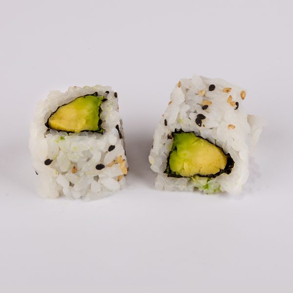 Arroz por fuera con sesamo blanco y negro , alga nori por dentro relleno de salmón, aguacate, pepino y salsa japonesa